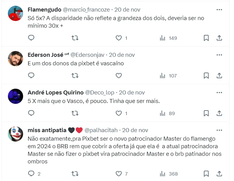 A PixBet é a patrocinadora do Vasco da Gama, que desembolsa cerca de R$ 22 milhões por ano. Ou seja, se a informação de Edmundo se confirmar, o Flamengo receberia incríveis R$ 110 milhões no novo contrato.
