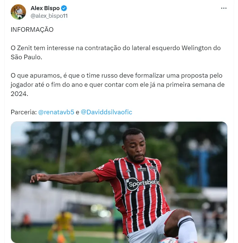 De acordo com informações de Alex Bispo, o Zenit deve entrar com uma oferta pelo jogador do São Paulo até no final do ano e deseja contar com o atleta já na primeira semana de 2024.