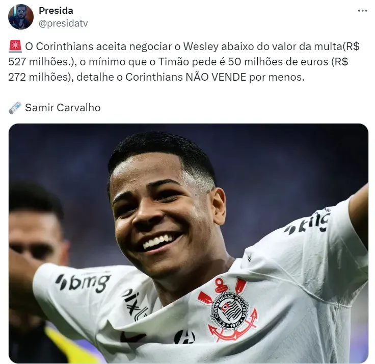 O Corinthians está aberto a fazer negócios envolvendo o nome de Wesley, hoje, titular da equipe, por um valor de 50 milhões de euros. Inicialmente, a pedida era apenas com a multa (100 mi de euros).