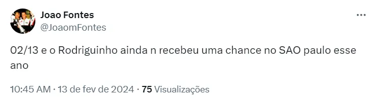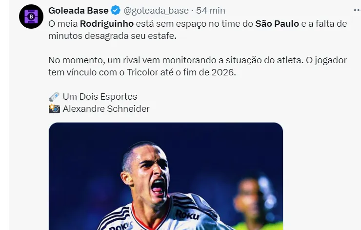 Rodriguinho é um jovem de apenas 19 anos de idade que é cria do Tricolor, mas não entra em campo há bastante tempo. Seus primeiros jogos foram em 2022, com Rogério Ceni.