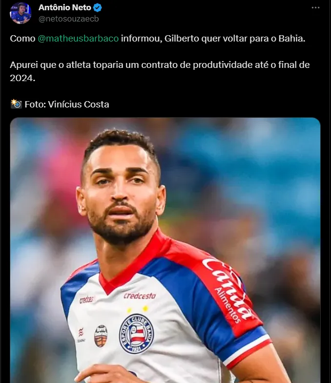 Desse modo, o atleta aceita fechar com outro clube da Série A. De acordo com as informações publicadas por Matheus Barbaço e Antônio Neto, Gilberto quer voltar ao Bahia, clube onde fez grande sucesso.
