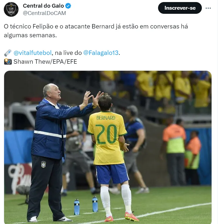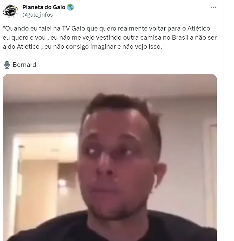 Fortemente ventilado no Galo, há informações do portal FalaGalo13 que Felipão, treinador do time mineiro, já ligou para Bernard para afirmar que conta com seu futebol para 2024.