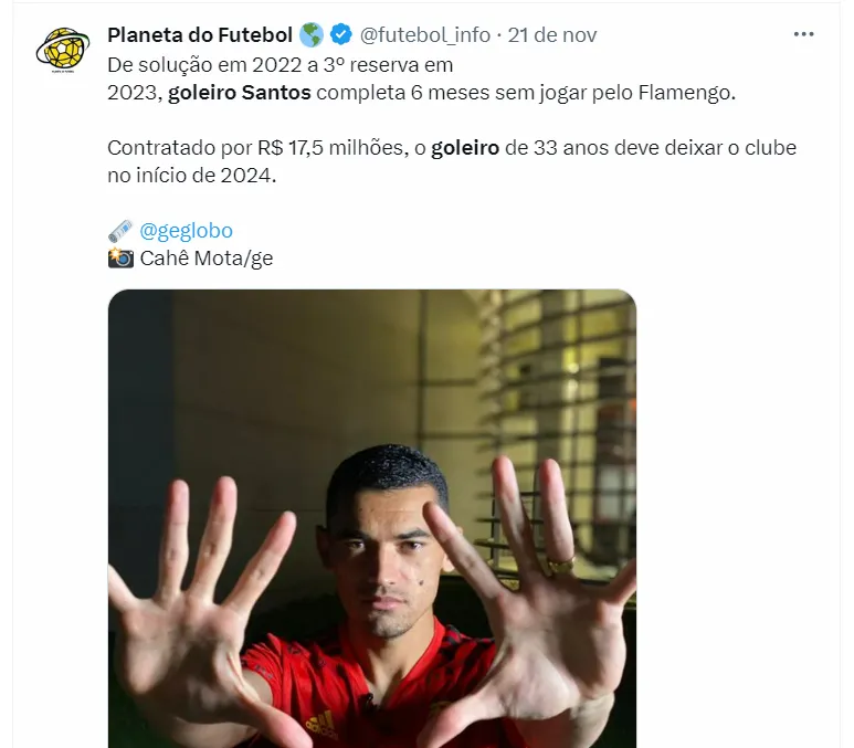 No entanto, em 2023, Santos entrou em má fase, perdeu espaço, se tornou apenas o terceiro goleiro do Flamengo e, assim, segundo fontes que cobrem o clube, irá deixar o time de Tite em 2024.