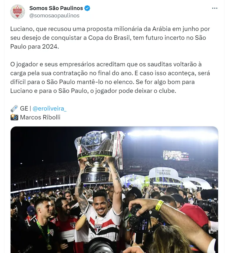 Luciano está considerando deixar o São Paulo na próxima temporada. Como camisa 10 do gigante paulista, o jogador recusou uma oferta do futebol saudita no meio deste ano, mas está considerando aceitar novas propostas do exterior em 2024. De acordo com o “GE”, Luciano entende que o futebol saudita representa sua última chance de uma grande transferência para o exterior.