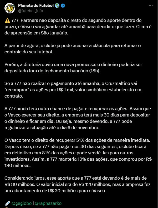 De acordo com as informações publicadas pelo GE, o Vasco ainda não recebeu os valores do aporte financeiro prometido pela 777 Partners e pode acionar a cláusula de retomar o controle do clube.