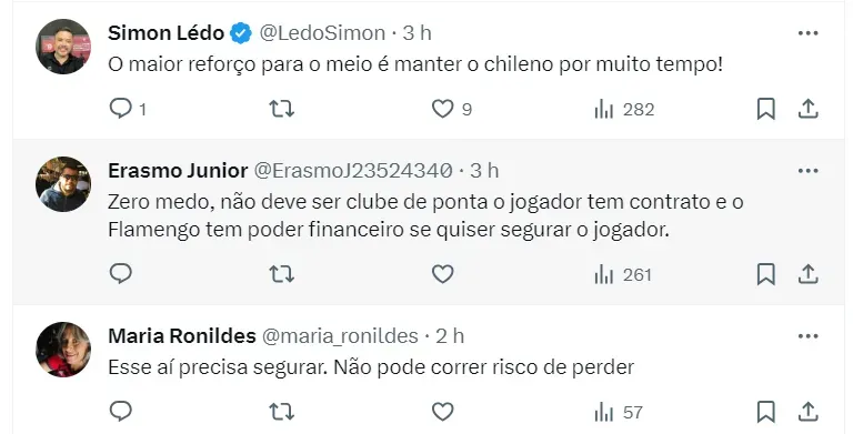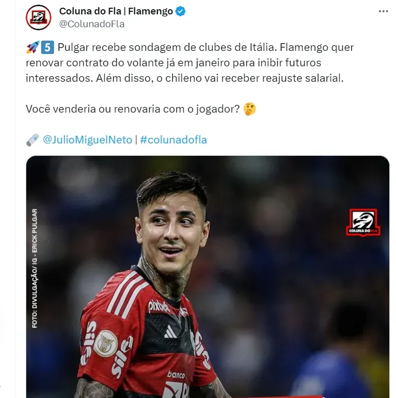 Em meio a sondagem pelo futebol do volante, o Flamengo deseja renovar seu contrato, que vai até 2025. Pulgar é titular absoluto do time de Tite e perdê-lo seria um grande baque para a torcida. A informação vem de Julio Miguel Neto.