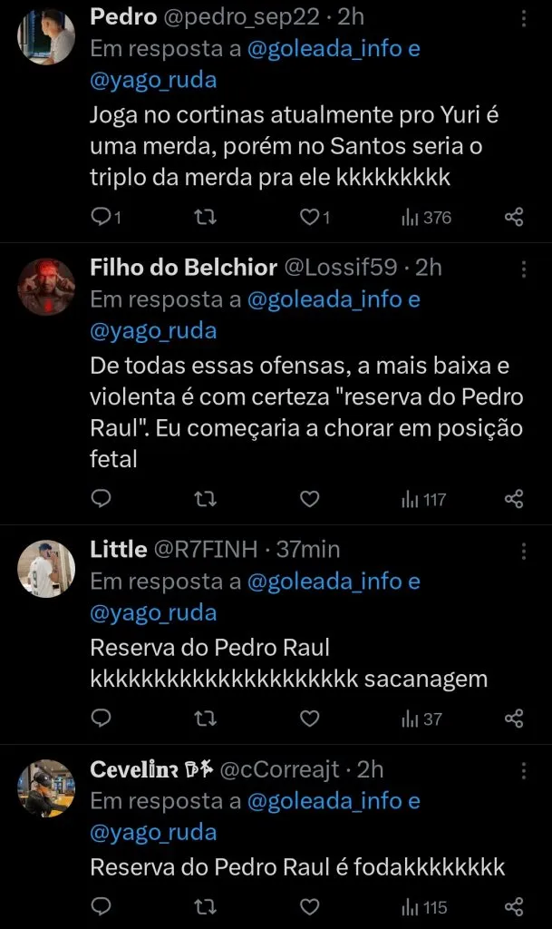 “Perna de pau”, “pipoqueiro”, “burro” e “reserva do Pedro Raul”, dentre outras coisas a mais, foram provocadas pelos santistas em direção a Yuri Alberto na noite de hoje em pleno Alçapão.