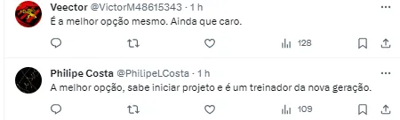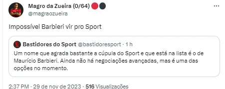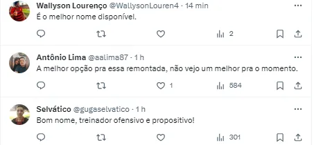 A torcida se manifestou nas redes sociais após o interesse vir à tona: “Treinador” , “Esse aí é pior que Enderson com a imprensa” , “Bom nome”, outros criticaram a escolha do nome: “Impossível ele vir para o Sport” , “Mauricio Barbieri é o mesmo que fracassou no bragantino e faliu o ano de 2023 do Vasco?“