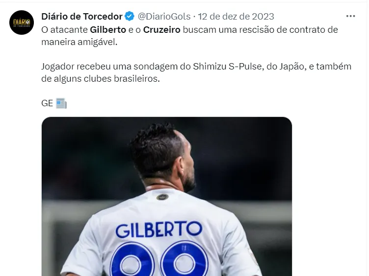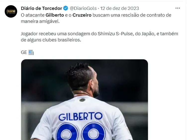 Gilberto, de saída do Cruzeiro, foi oferecido ao clube do Morumbi como uma oportunidade de negócio a custo zero. O atleta, que já viveu bom momento no Brasil, não conseguiu render na Raposa e vai sair.