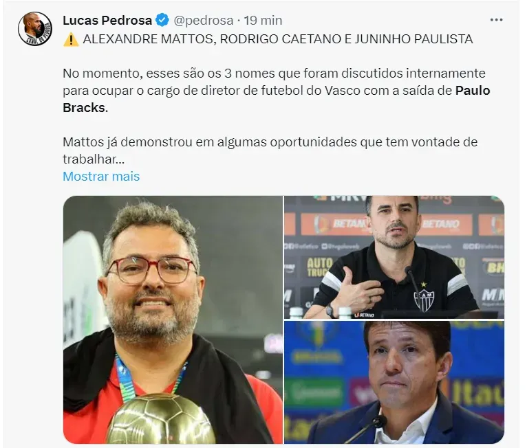 Além de Mattos, outros nomes ganham força dentro do Vasco da Gama, como os casos de Rodrigo Caetano, do Atlético-MG, e Juninho Paulista, ex-Seleção Brasileira.