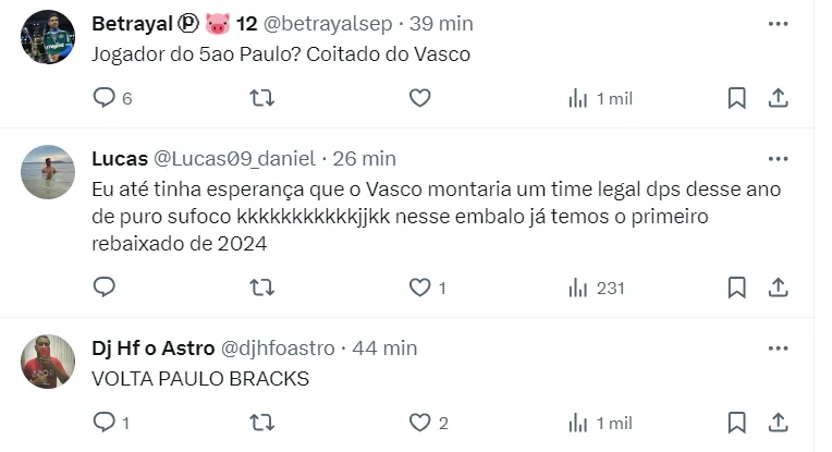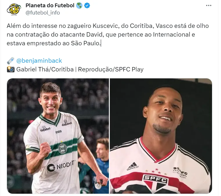 Além de Kuscevic, o Vasco tem interesse na contratação do atacante David, que ainda defende as cores do São Paulo, junto ao Internacional de Porto Alegre. De acordo com o apresentador, o clube da Colina está atento na situação do jogador para 2024.