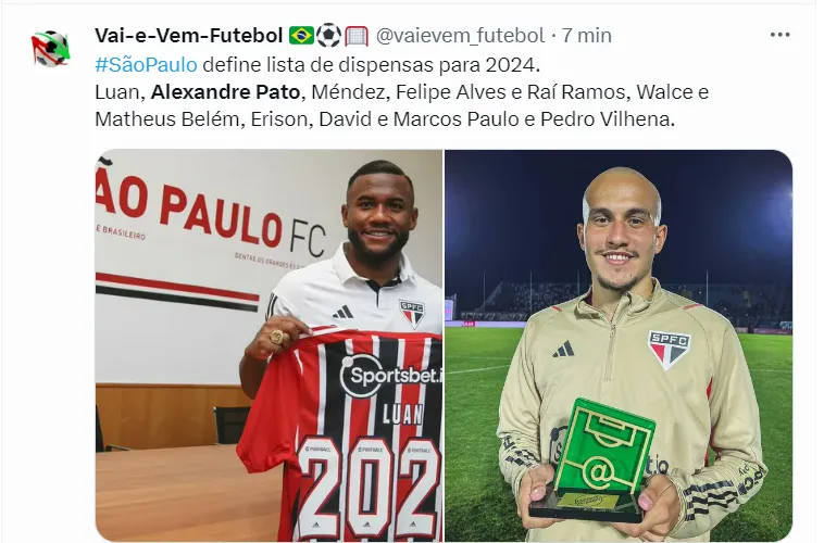 Alexandre Pato encontra-se em fim de contrato com o São Paulo e já sabe que não terá seu vínculo renovado para o ano de 2024. O atleta assinou um contrato de apenas seis meses, e deixa o Tricolor com dois gols marcado.