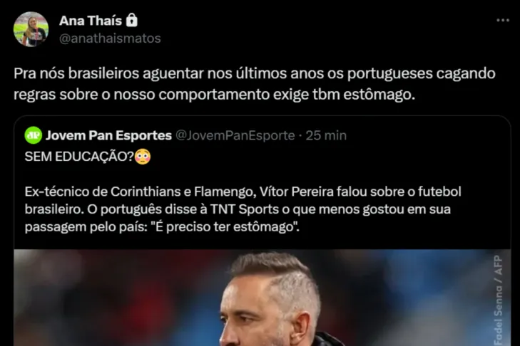 Ana Thaís Matos não deixou passar em branco e criticou duramente a polêmica declaração de Vitor Pereira, ex-Corinthians e Flamengo, sobre o futebol brasileiro. Segundo Vitor Pereira, não há muita educação no Brasil, uma afirmação que não foi bem recebida pela jornalista do Grupo Globo.