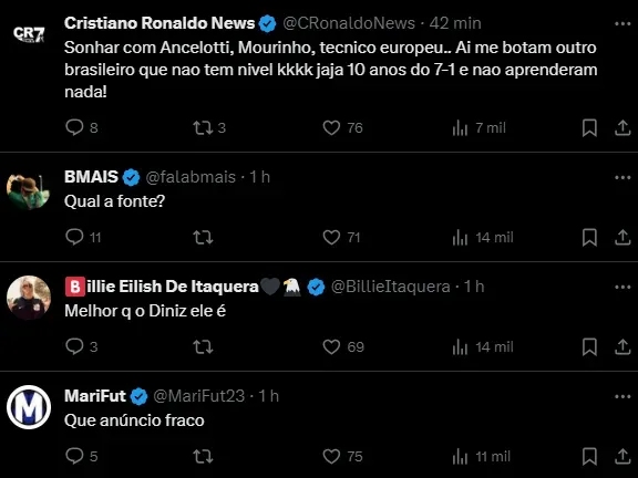 “Um modo diferente de treinar os atletas”, havia destacado o executivo na apresentação de Diniz. Ele ainda completou que esperava que a Seleção saísse da mesmice “para situações arrojadas”.