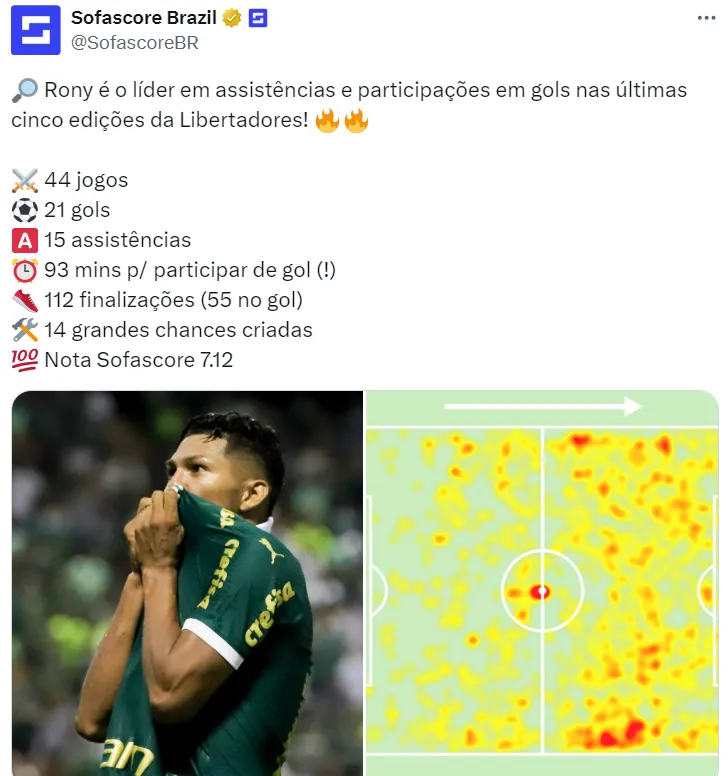 Na Libertadores, Rony mostra que merece ser respeitado. Em dados do Sofascore, ele aparece como o líder de assistências e também como o grande líder em participações em gols nas últimas cinco edições da competição. Ou seja, nenhum jogador fica acima do camisa 10.