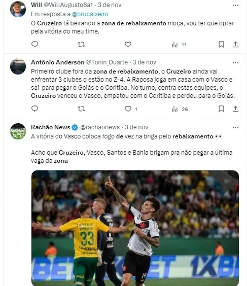 “A zona de rebaixamento tá ficando um pouquinho mais bem desenhada. Goiás, Coritiba e América-MG eu acho que já era. Eu falei outro dia no Cruzeiro, que engatou uma sequência boa e deu uma respirada… nesse momento, para se juntar a Goiás, Coritiba e América-MG, o Cruzeiro é o mais favorito, mesmo com aquela respirada. Tá ficando mais desenhada a zona de rebaixamento, já tem time escapando.”, disse, no canal do YouTube da TNY Sports.