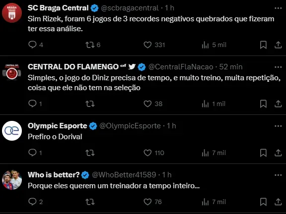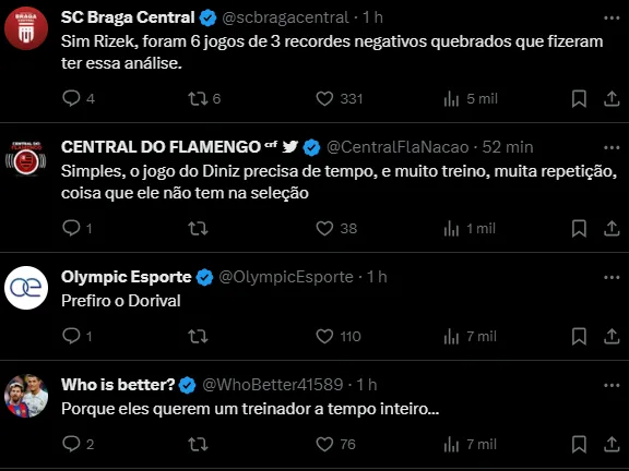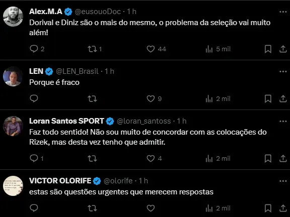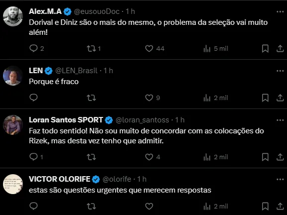 “Mas quem é que faz essa análise técnica? Se o Diniz servia para ser o interino do Ancelotti, por que ele não serve para ser o efetivo? Foram 6 jogos que fizeram a CBF avaliar que ele não é bom? Fica a pergunta no ar”, indaga Rizek.