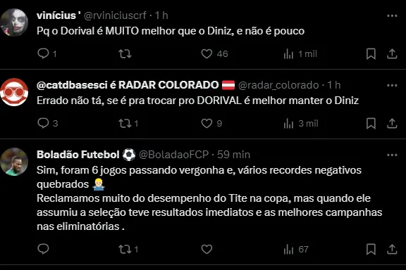 “Por que contratar Dorival Júnior e não manter Fernando Diniz? Não sou contra a contratação do Dorival, acho que eles têm níveis semelhantes e qualquer um deles seria uma boa escolha para os padrões brasileiros”, iniciou o jornalista.