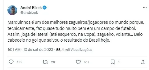 Nas redes sociais, o jornalista André Rizek não poupou elogios a Marquinhos, destacando-o como um dos grandes zagueiros do planeta em sua posição. O defensor, que também atua pelo PSG, impressionou Rizek não apenas por seu desempenho sólido na defesa, mas também por sua versatilidade.