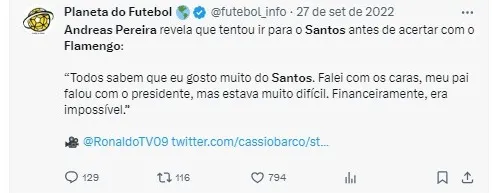 ”Eu sempre tive um carinho muito grande pelo Santos, mesmo indo para o Flamengo depois. O Flamengo é um clube que também mora no meu coração, mas a minha família inteira é santista”, afirmou o jogador. ”Pode ser sim, que um dia, se eles quiserem… Quem sabe? Do futuro ninguém sabe”, disse Andreas.
