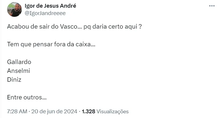 O nome de Diniz é um possível alvo pela fase atual do Fluminense. O clube carioca, atual campeão da Libertadores, é o lanterna do Brasileirão 2024 e vai de mal a pior. Com a chance de queda no Rio de Janeiro, a possibilidade surge no ar. Nomes como de Gallardo, ex-River Plate, também é mencionado pelo torcedor.