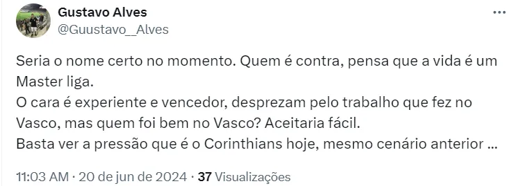 O nome do treinador argentino ganha força dentro do Corinthians apenas diante dos torcedores neste momento. Parte são a favor, enquanto tem aqueles que são contra a chegada do ex-treinador do Vasco.