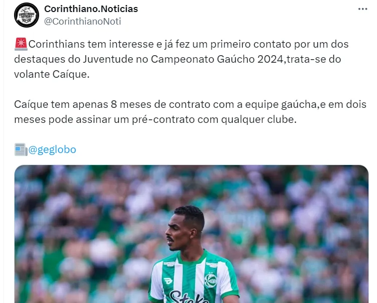 A situação de Caíque com o Juventude é de um contrato que vai até dezembro de 2024. Em dois meses, ele estará apto a assinar um pré-contrato com qualquer clube interessado em seu futebol. O clube de Itaquera está ciente sobre isso.