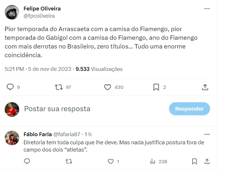 Além dos comentários sobre a atuação da equipe, parte da torcida do Mais Querido criticou Arrascaeta, um ídolo do clube, alegando que ele não está tendo um grande desempenho em 2023.