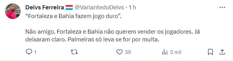 De olho nos dois atletas, o Palmeiras sabe que terá que abrir os cofres se quiser mesmo reforçar seu elenco. Isso porque, assim como o Bahia, o Fortaleza faz jogo duro por Caio Alexandre.