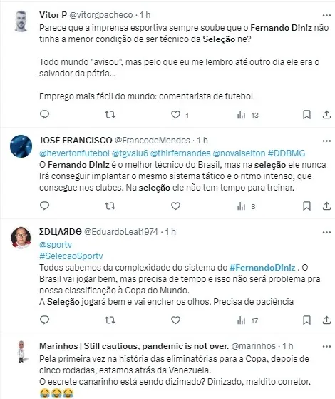 “A esperança é que o Ancelotti realmente assuma essa seleção na Copa do Mundo. Em um torneio de um mês, precisa ter um cara experiente para fazer os caras jogar. Diniz, você evoluiu, mas não está pronto”, complementou Nilson Cesar.