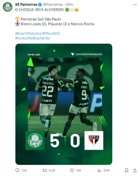 Na 29ª rodada do Campeonato Brasileiro, o Choque-Rei trouxe uma vitória esmagadora do Palmeiras sobre o São Paulo por 5 a 0, agravando a situação difícil do tricolor no campeonato.