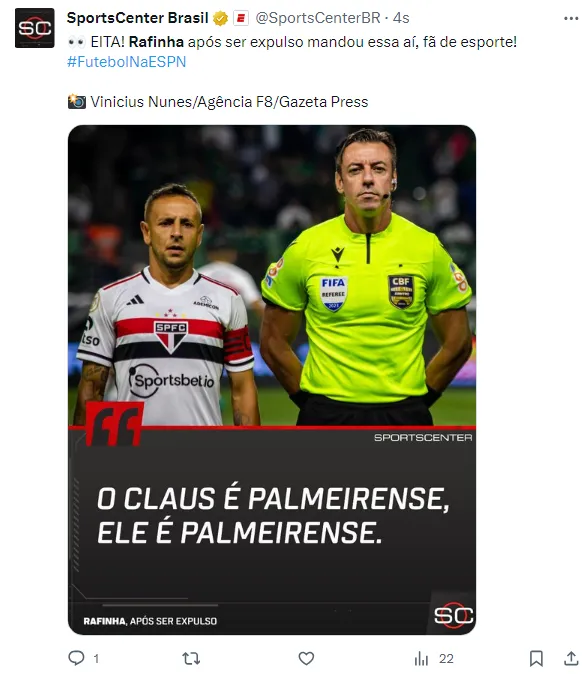 Após receber o segundo cartão amarelo por uma falta dura aos 16 minutos do segundo tempo, em cima do atacante Breno Lopes, o experiente lateral e capitão do São Paulo, Rafinha, expressou sua insatisfação ao sair do campo, afirmando ao quarto árbitro que Raphael Claus era torcedor do Palmeiras.