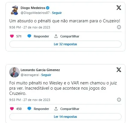 Comentários de revolta, questionamentos à atuação da arbitragem e chamados por uma revisão mais detalhada do VAR foram destaque nas timelines, evidenciando a intensidade das emoções geradas por esse episódio.