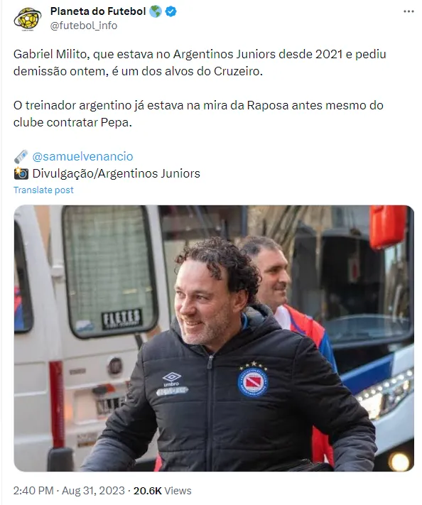 O ex-jogador e atual treinador Gabriel Milito, irmão do lendário atacante Diego Milito, estava no Argentinos Juniors, da Argentina. Milito atuou no clube argentino desde 2021; no entanto, em nota oficial da equipe, o técnico renunciou ao seu cargo e pediu demissão.