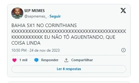 Após a derrota histórica do Corinthians, diversos memes da goleada aplicada pelo Bahia, tomaram conta das redes sociais; Veja