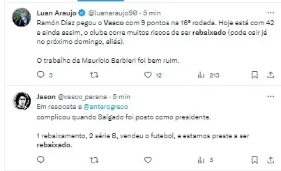 “Perde (contra o Grêmio) e vai empatar (contra o Red Bull Bragantino). O Vasco vai fazer 43 pontos. Se o Bahia ganhar amanhã, o Vasco cai com 43 pontos.”, alertou Neto durante a transmissão na Rádio Craque Neto.