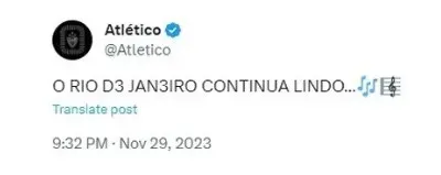 Em seu perfil oficial, o clube mineiro escreveu: “O Rio d3 Jan3iero continua lindo…”, destacando o número 3, que corresponde à quantidade de gols marcados pela equipe na partida.
