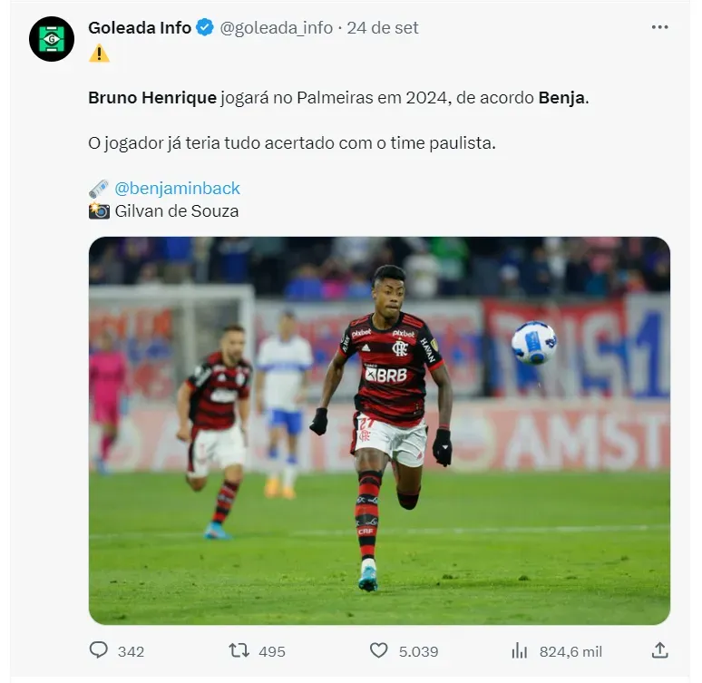 Segundo informações de Benjamin Back, Bruno Henrique jogará no Palmeiras a partir do ano de 2024, quando seu contrato com o Flamengo se encerrará. ‘A informação que eu tenho é que ele já acertou com o Palmeiras’, diz ele.