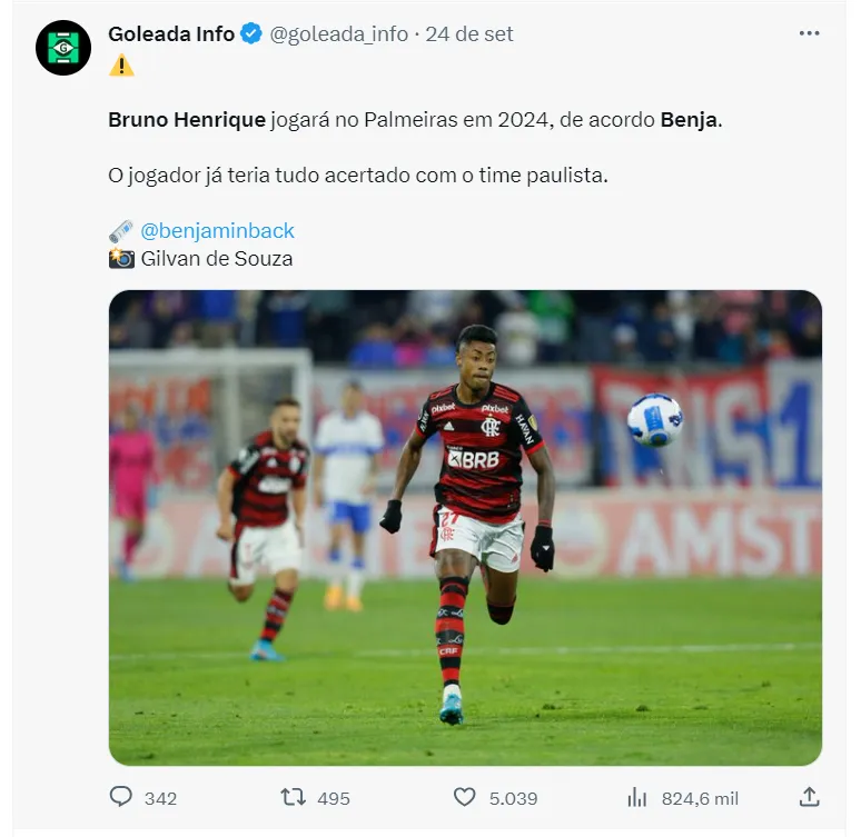“A informação que eu tenho é que Bruno Henrique já acertou com o Palmeiras. O que eu recebi é que ele pediu 2 anos de contrato e o Flamengo não quis. A informação que eu tenho é que Bruno Henrique joga no Palmeiras em 2024”, disse Benja.
