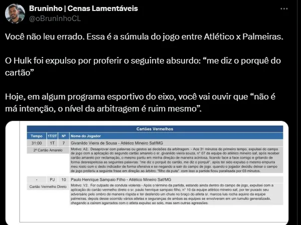O dublador Gustavo Machado fez a leitura labial do que disse Hulk ao árbitro Rodrigo José Pereira de Sá na derrota do Atlético Mineiro pelo placar de 4 a 0 diante do Palmeiras.