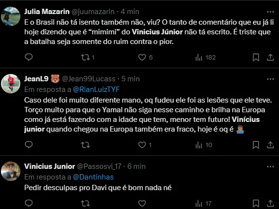 “Estou aqui lutando, tentando, não por mim. Se fosse só por mim eu já teria desistido, ficaria em casa que não tem agressão, ninguém me xinga”, finalizou Vinícius Júnior.