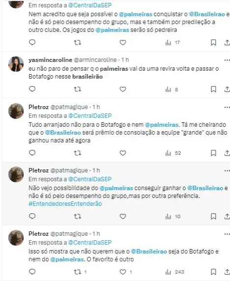 “O Palmeiras tem condição, se ganhar o confronto direto, de ser campeão brasileiro de novo porque está acostumado a essas situações”, pontuou o comentarista. “Ter o Palmeiras no retrovisor, a luz verde no retrovisor, é o pior dos mundos. Porque outros times não têm a mesma solidez do Palmeiras”, disse.