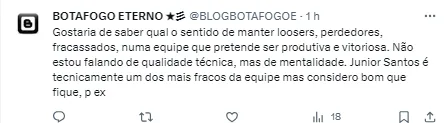 Já Gabriel Pires e Luís Henrique, emprestados ao Benfica e Olympique de Marselha, o clube carioca quer manter a dupla, mas negociará. Diego Costa ficará livre e o time precisará negociar a renovação. Há situação de Carlos Alberto, que é visto como atleta que pode ser comprado, segundo o portal. Como dito pela reportagem, há outras situações, mas a ideia é manter a base do elenco atual.