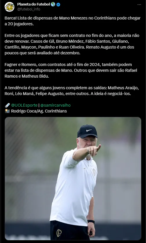 De acordo com as informações publicadas pelo jornalista Samir Carvalho, no UOL, o Corinthians pode acertar a saída de até 20 jogadores a pedido de Mano.