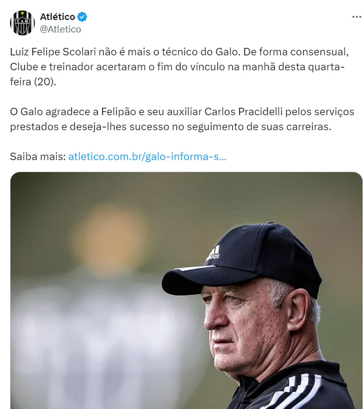 Felipão deixa o comando do Galo com 41 jogos disputados, 19 vitórias, 10 empates e 12 derrotas. Ele chegou ao clube em 2023, depois de deixar o Athetico-PR.