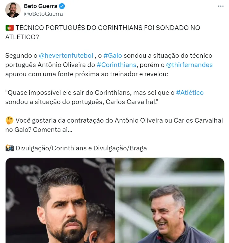 De acordo com informações de Heverton Guimarães, o Atlético-MG teria sondado a situação de António Oliveira, técnico do Corinthians, que acabou de chegar no time de Itaquera.