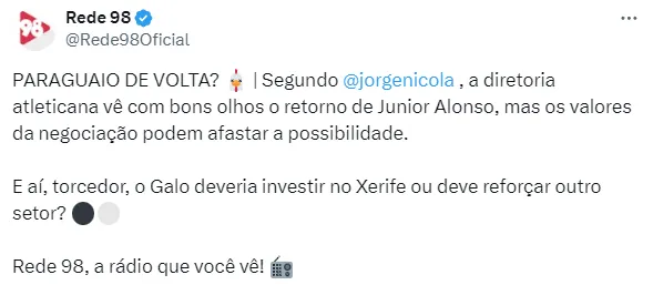 Jorge Nicola conta que, dentro do Atlético Mineiro, há pessoas que que defendem a contratação do zagueiro Júnior Alonso. Atualmente, o paraguaio defende o Krasnodar.