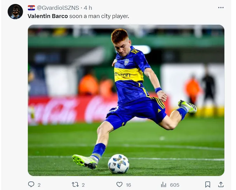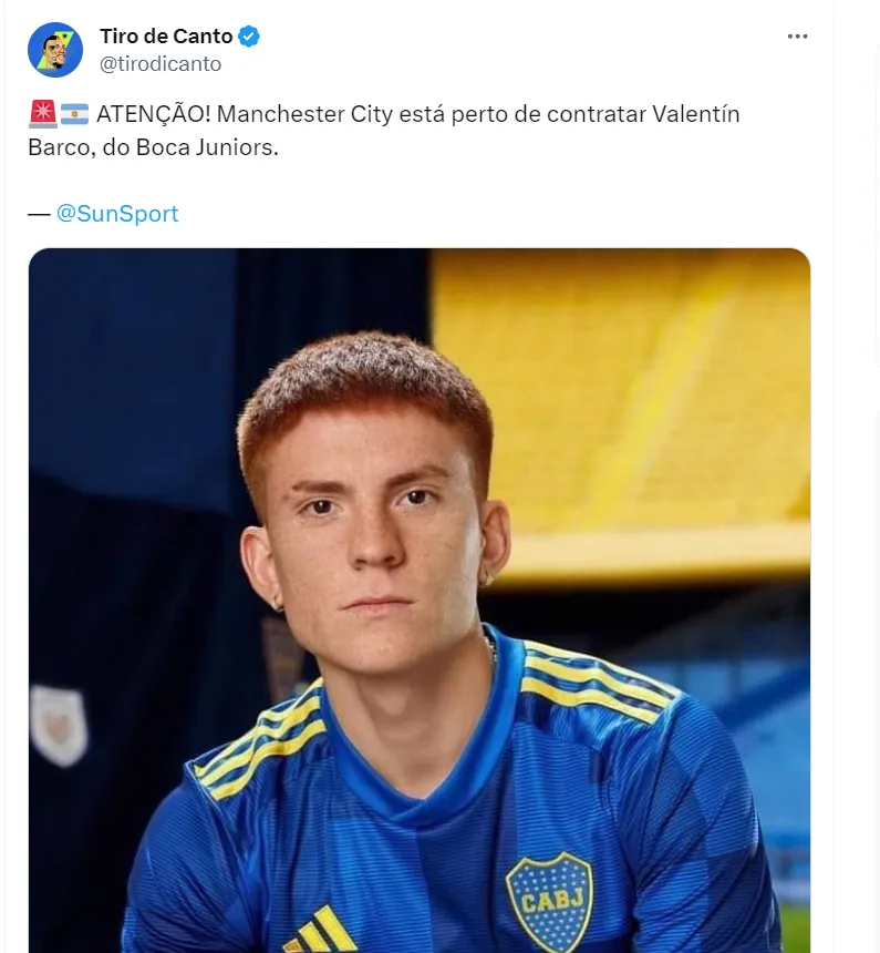 De acordo com informações do ‘Sun Sport‘, o Manchester City, de Guardiola, encaminhou a contratação de Valentín Barco, do Boca Jrs, para o ano de 2024. O clube inglês era um dos maiores interessados no atleta.
