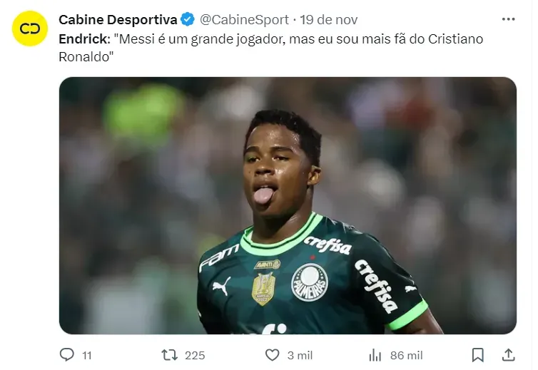 O segundo jogador mais valioso do futebol brasileiro na atualidade é outra jovem promessa, Endrick, do Palmeiras, que também está vendido para o futebol europeu. Endrick é avaliado em 25 milhões de euros.