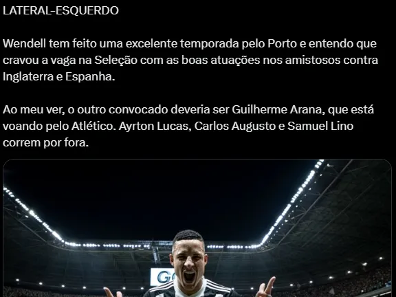 “O Dorival tem uma convocação até aqui na Seleção Brasileira. Quando ele fez a convocação, o Atlético jogava mal. Os laterais-esquerdos convocados foram Wendell e Ayrton Lucas. Já não concordei”, opinou Ale Lozetti.